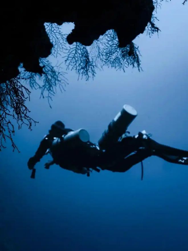 一道垂直向下的悬崖瞬间将深度拉至 130 米,悬崖中段横亘着一条宽不足 3 米的狭窄通道,被潜水界称为 “魔鬼弯道”。